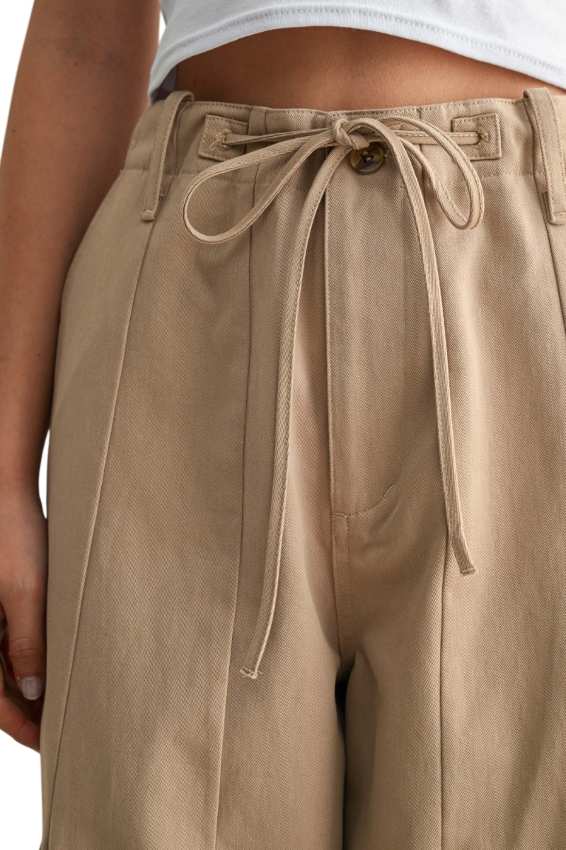 Solid cotton wide leg pants featuring an adjustable drawstring waist and front dart stitching.