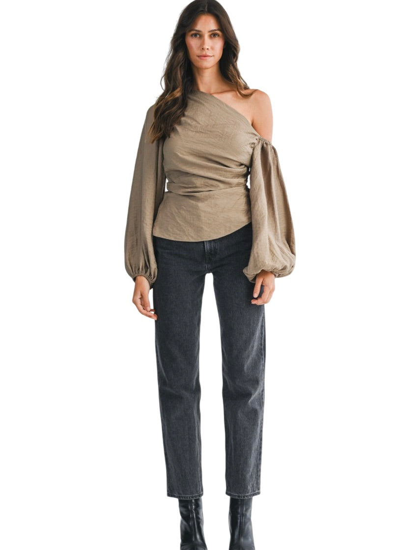 The Misa Blouse features balloon sleeves, one shoulder detail, side ruching and an invisible side zipper closure.