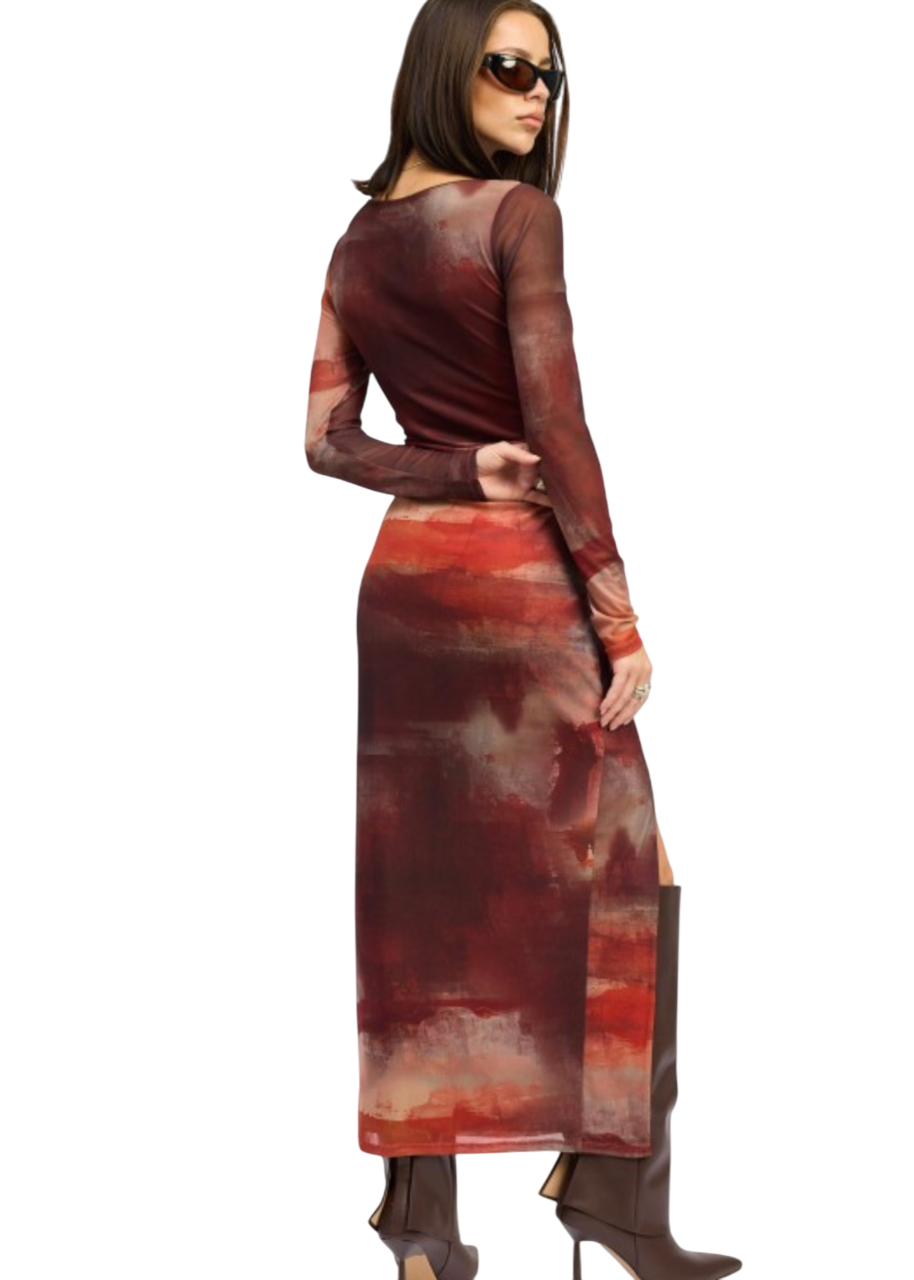 The Solera Dress features a rich abstract print and a side slit detail in a mesh fabrication